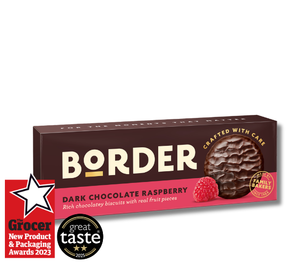 Launched in 2023, Dark Chocolate Raspberry biscuits combine rich dark chocolate with a vibrant raspberry flavour for an indulgent treat. Winning Silver in the Cakes & Biscuits category at the 'The Grocer’s New Product & Packaging Awards 2023' and later achieving a 2-Star rating at the 'Great Taste Awards' in 2025, classifying it as an “outstanding” product.